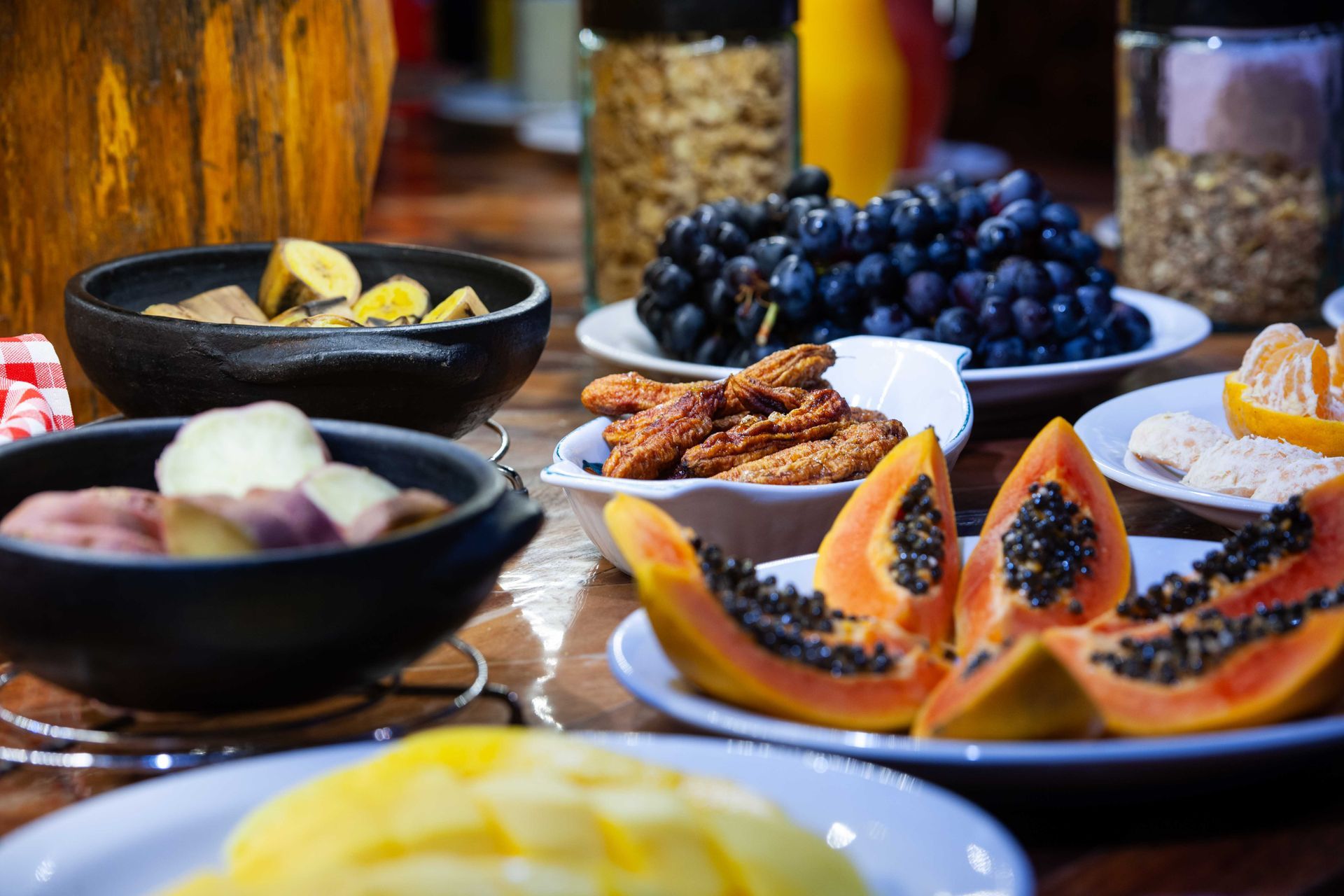 O café da manhã é preparado aqui mesmo, com produtos caseiros e opções que atendem a diferentes necessidades.